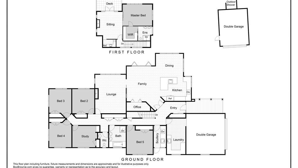Downstairs is all about space – there are 5+ bedrooms, large open-plan living with a modern kitchen, separate scullery, another living room with gas fireplace, a large study (or sixth bedroom), spacious laundry, family bathroom with separate toilet, a computer nook, double garage, and a lot of storage space. Upstairs, the master suite is like its own luxury apartment – complete with a living room with a fireplace, kitchenette, en-suite, walk-in-wardrobe, and sun-soaked balcony.