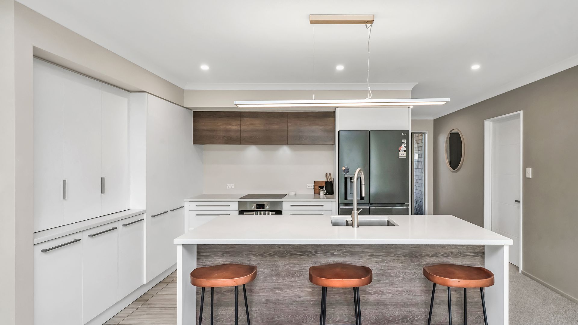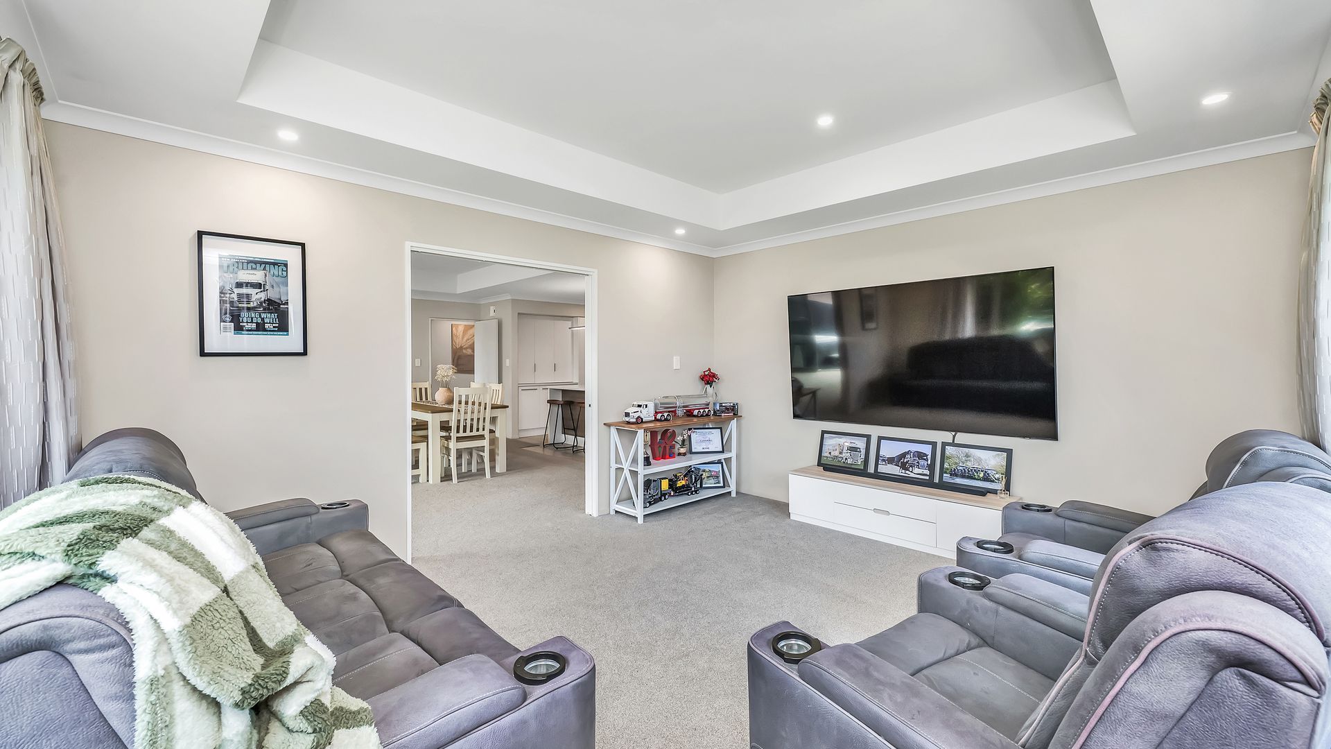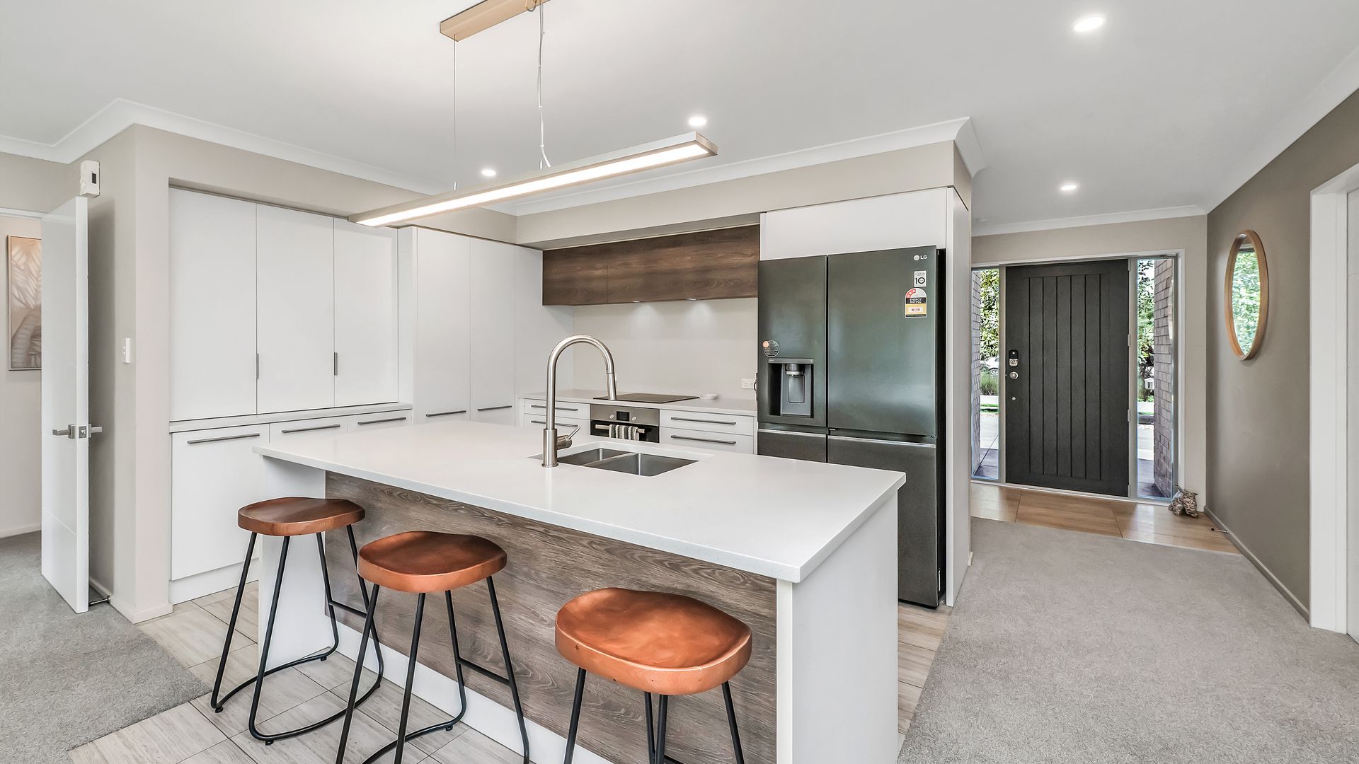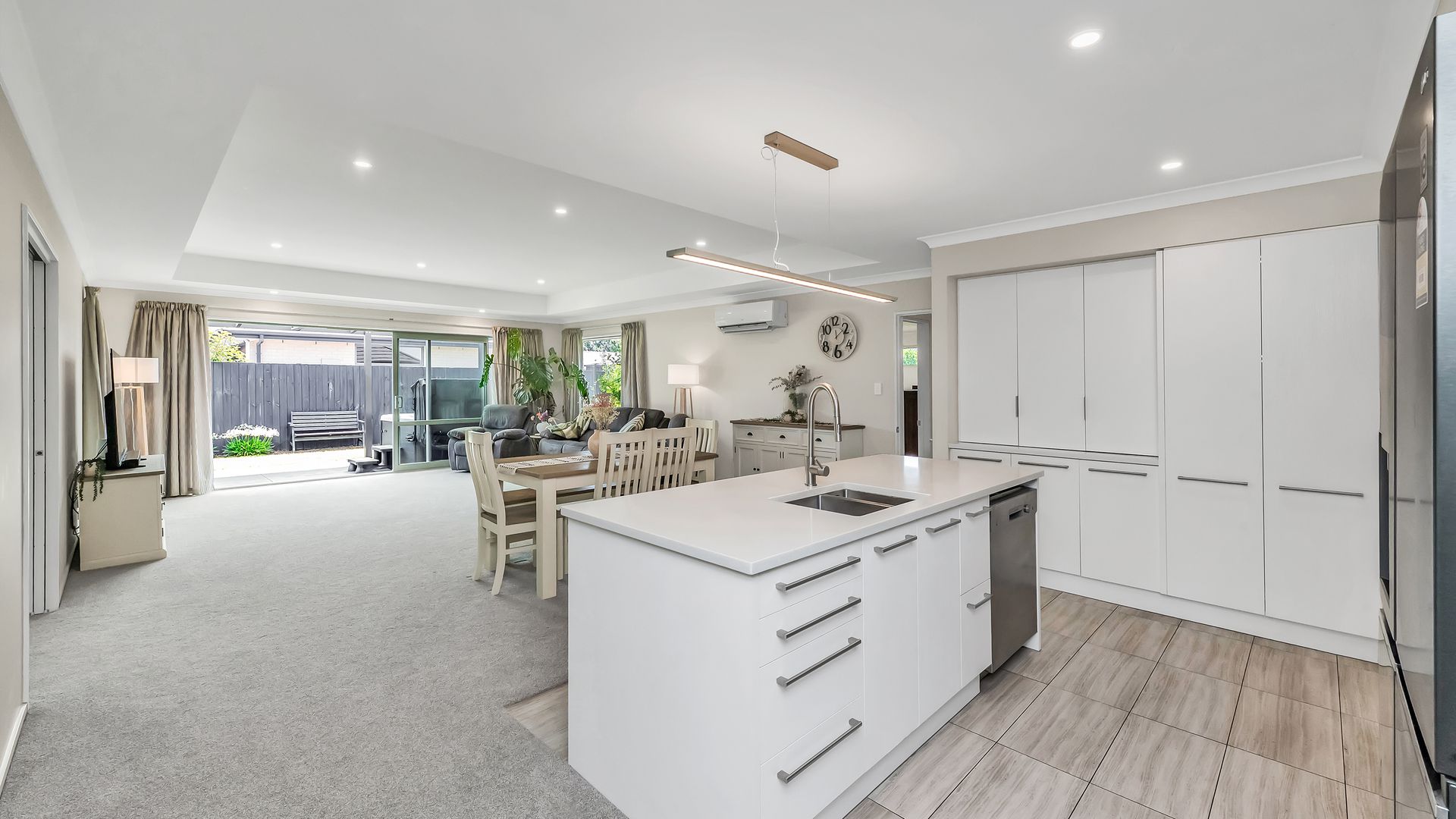Positioned to capture all-day sun, the home’s natural warmth is complemented by two heat pumps to ensure comfort in every season. The stylish, functional kitchen features quality Bosch appliances and engineered stone benchtops, overlooking the generously proportioned open-plan living and dining area. A separate lounge provides flexibility for hosting guests or simply giving the family extra space to spread out.