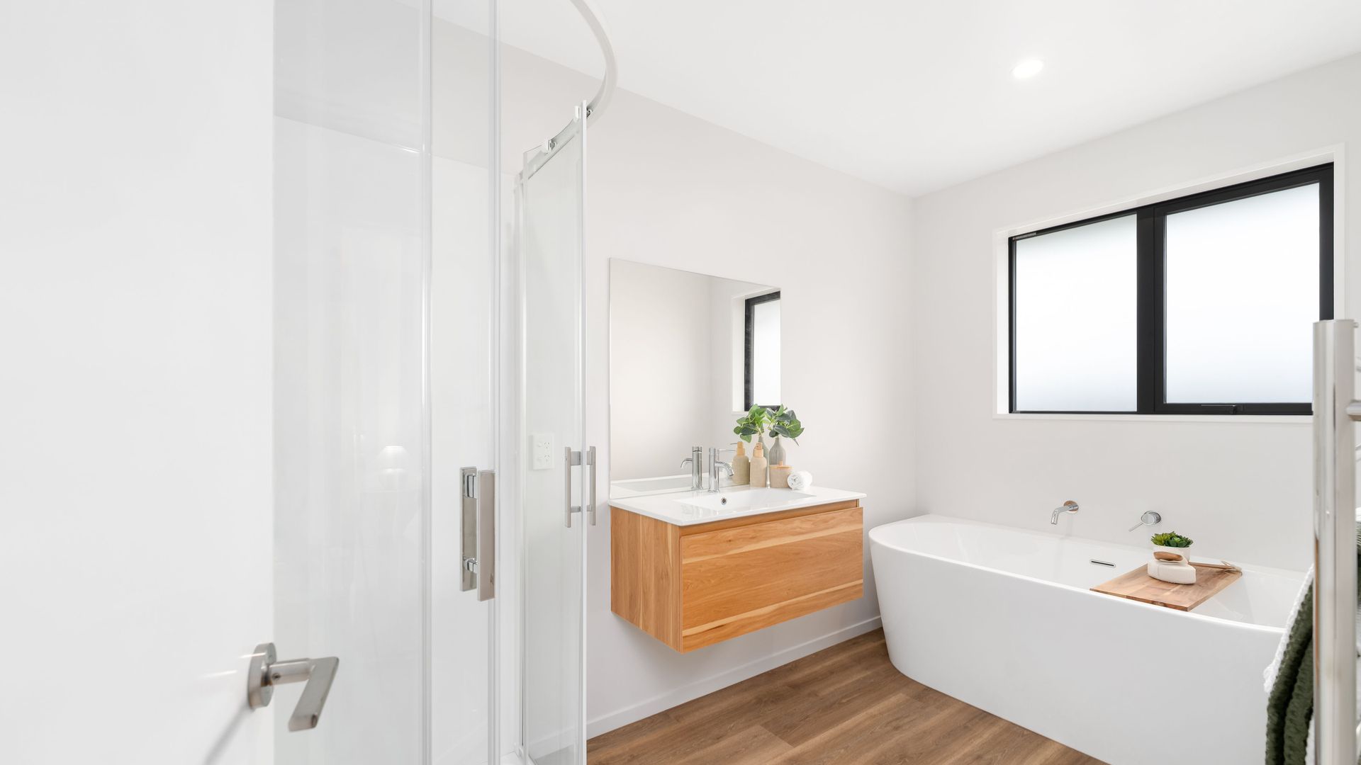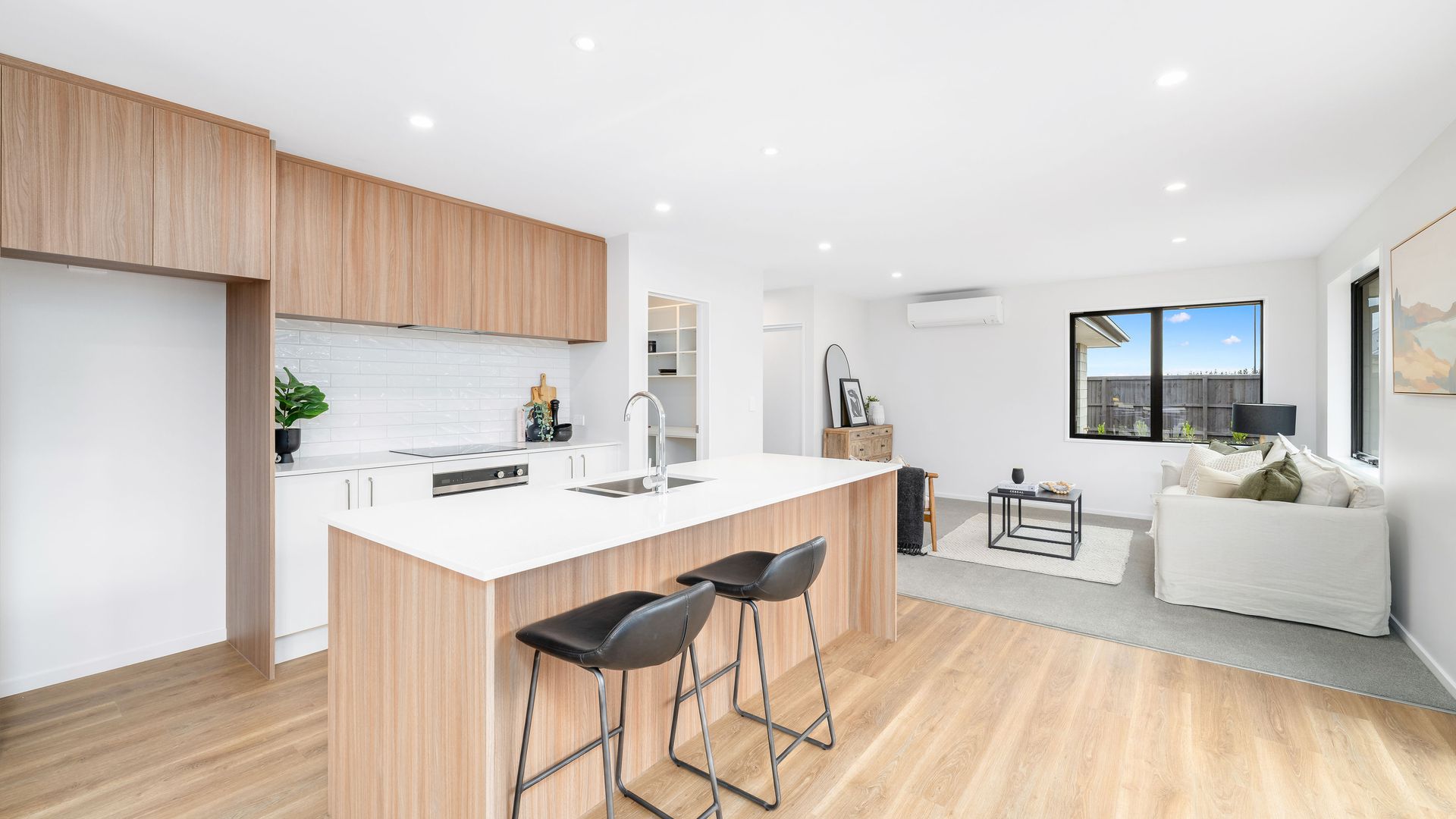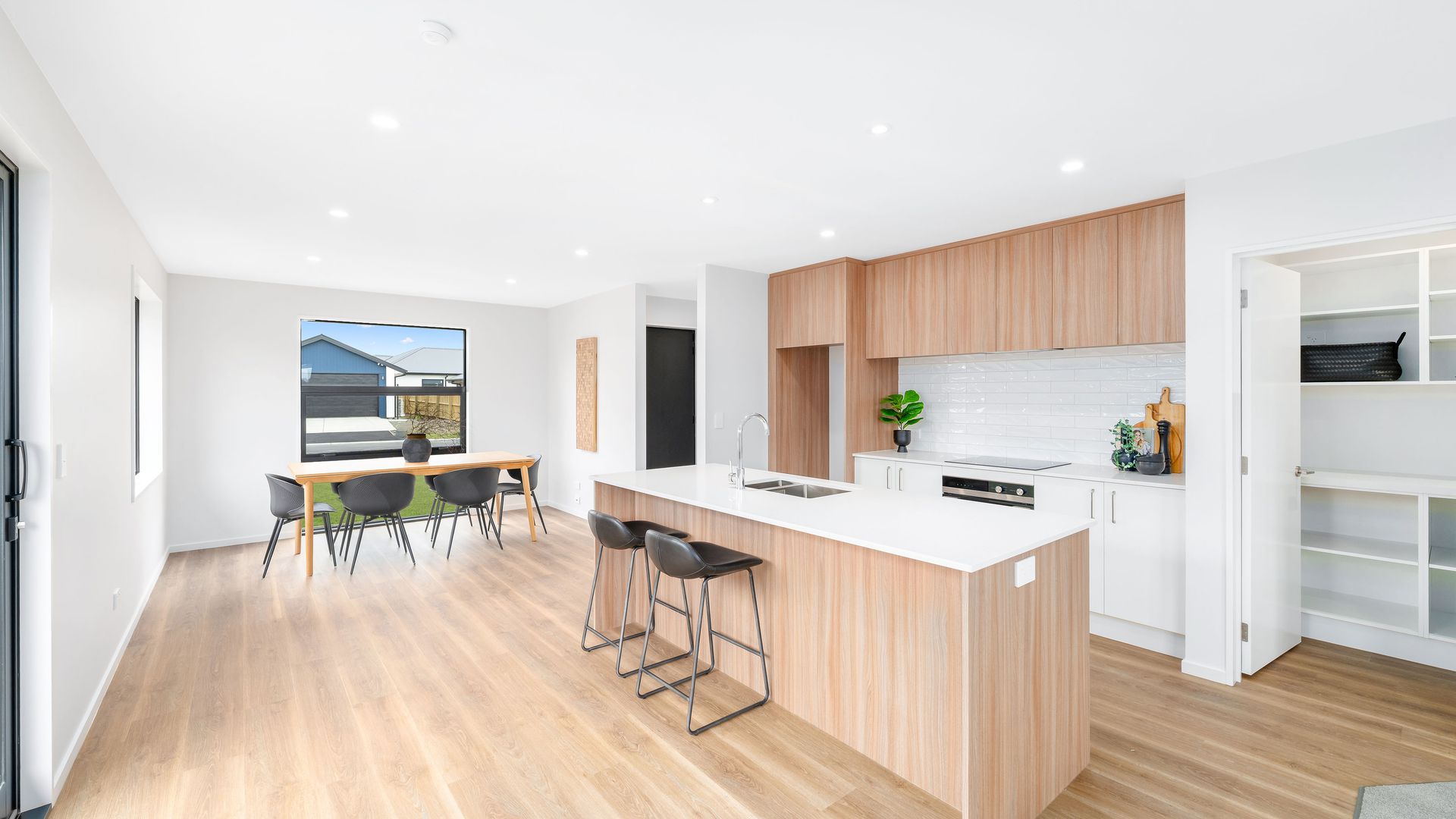 Sleek open-plan kitchen, complete with a walk-in pantry, seamlessly connects to the dining and living areas, creating a practical, modern hub for everyday life and entertaining. Large sliders open to a finished patio and neat, low-maintenance gardens, keeping outdoor living straightforward and enjoyable from day one.