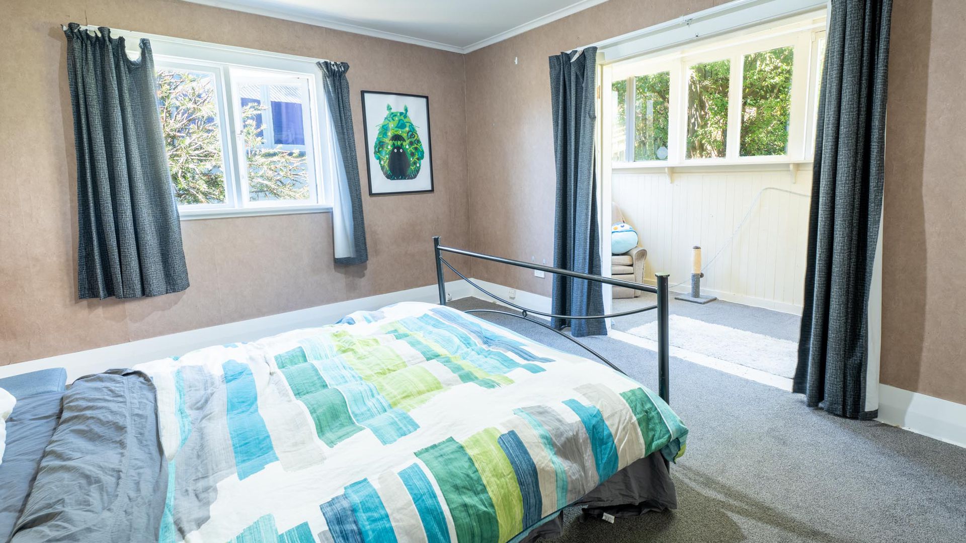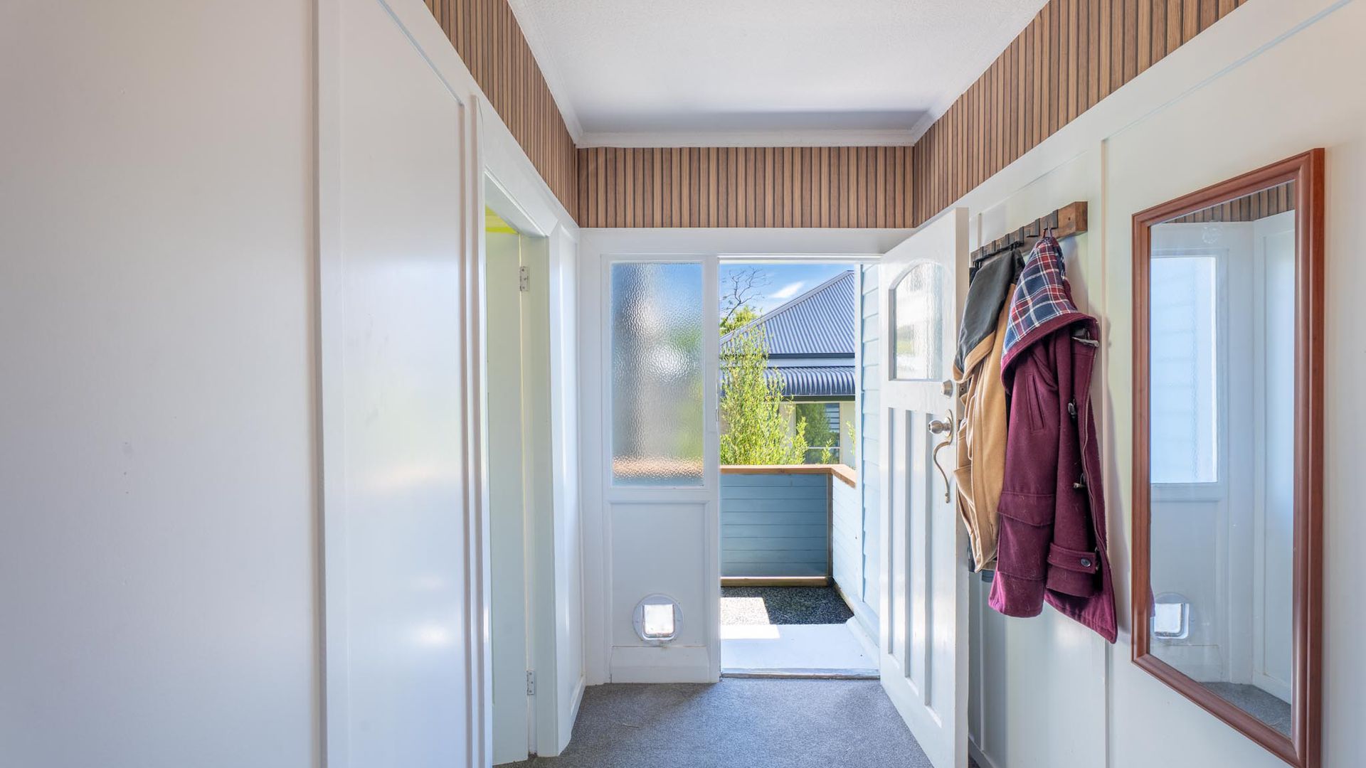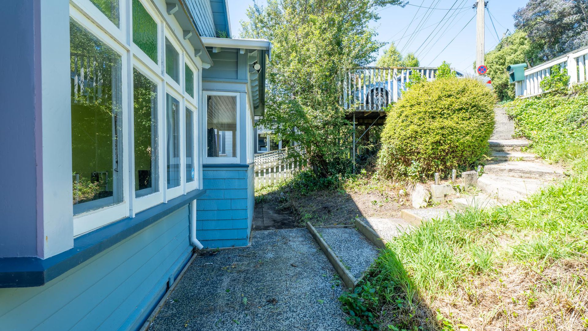 - Outdoors: A courtyard leads to steps down into a sunny, grassed backyard.