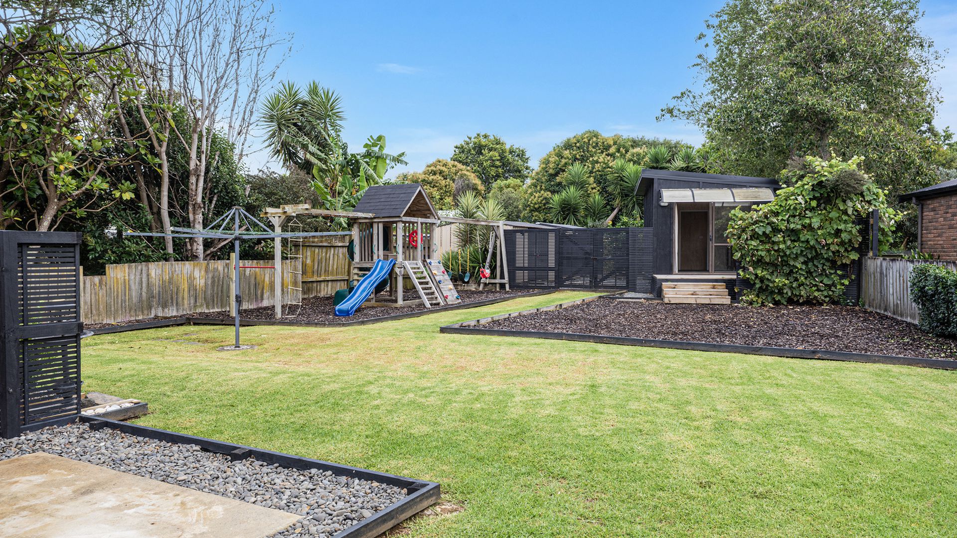 Outside, you will find flat, fully fenced, easy-care gardens. Metalled area, secure behind the fence for boat or caravan. At the rear a tropical encounter awaits with various fruit trees, two large sheds (one with power) and a newly built cabin with deck and power. Kids will love the onsite playground, adding further appeal for families.