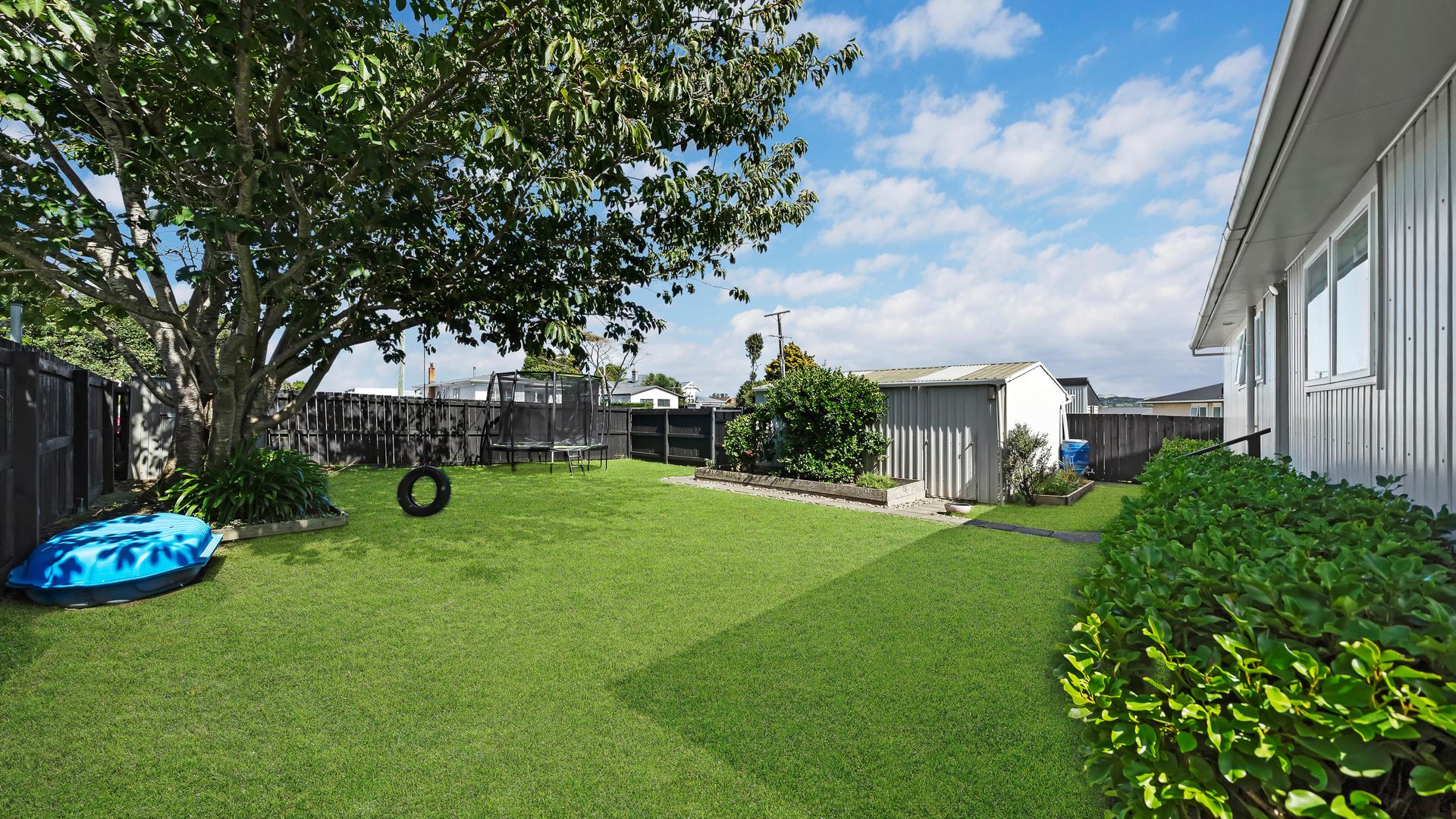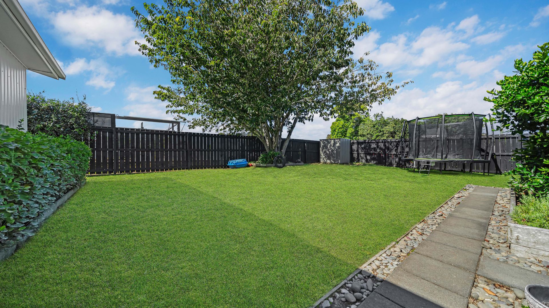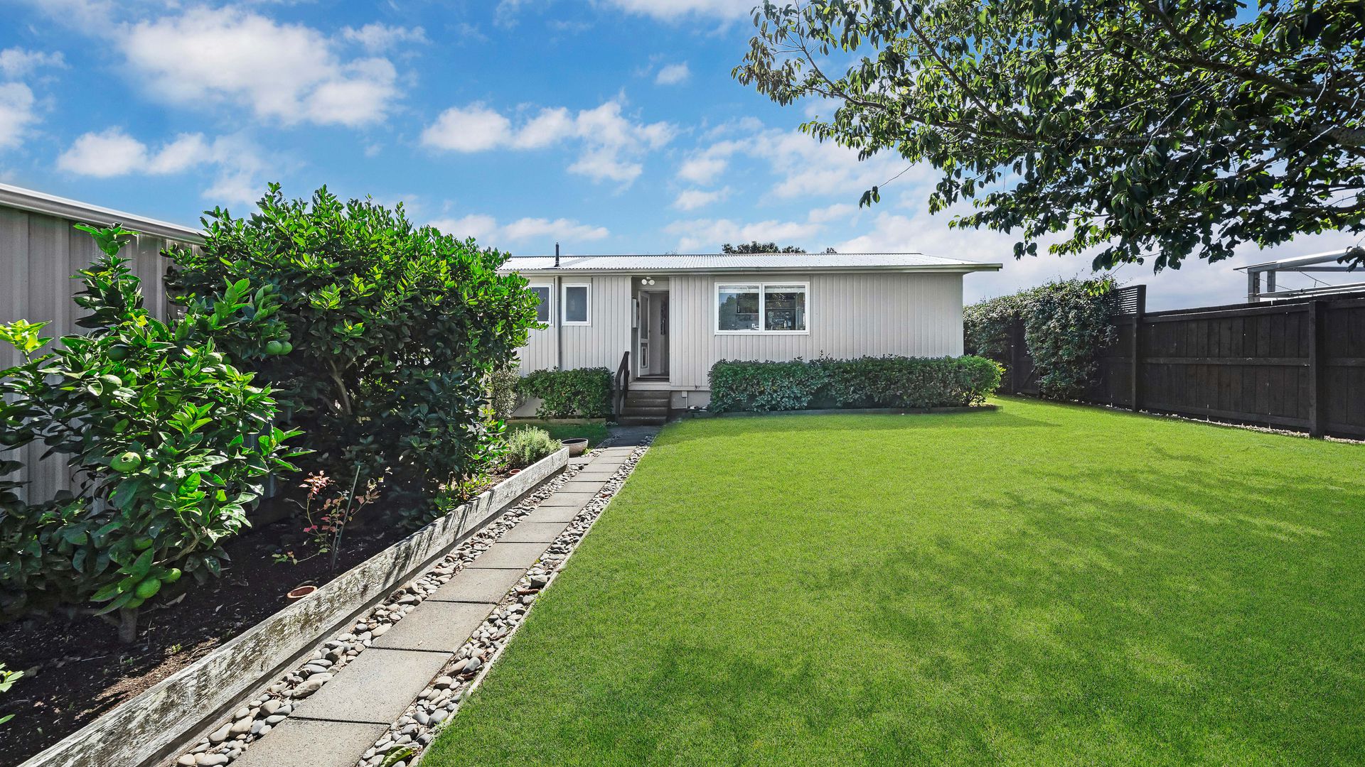 Set on a flat, fully fenced 468sqm section, there’s plenty of room for kids and pets to play safely on the expansive lawn, framed by simple, easy-care gardens and a lovely shade tree that adds to the home’s relaxed feel.