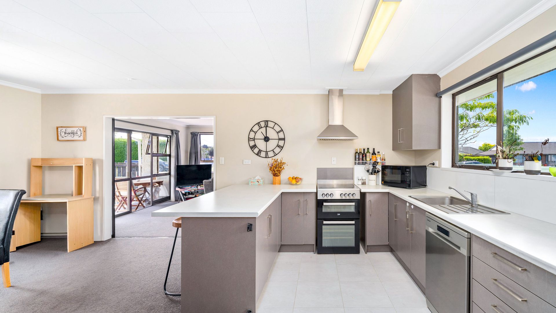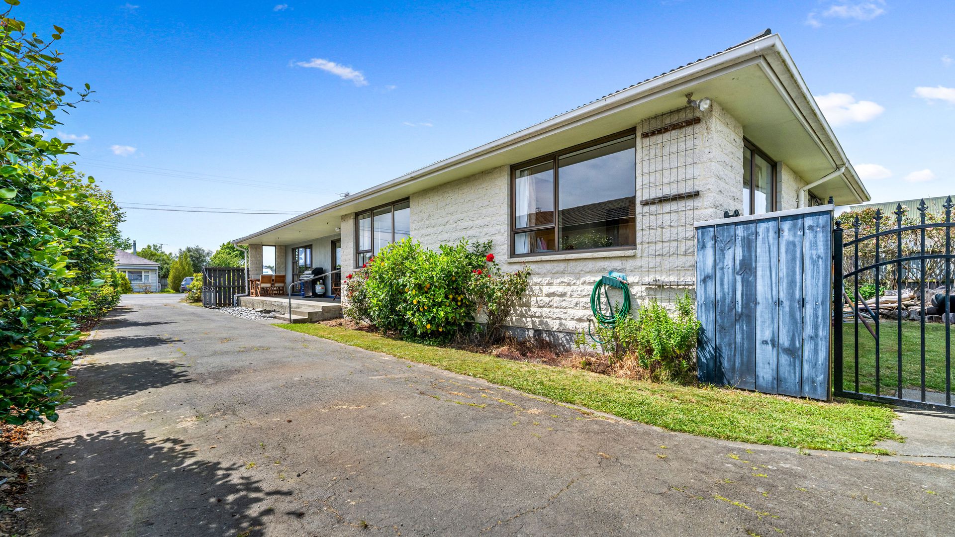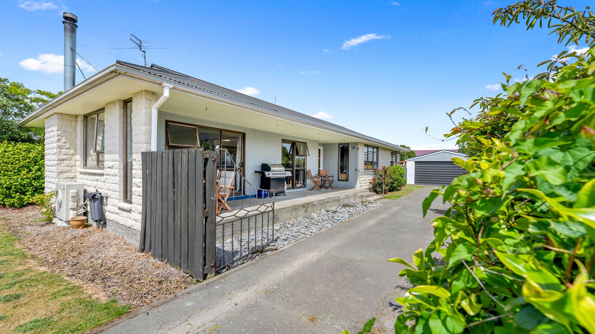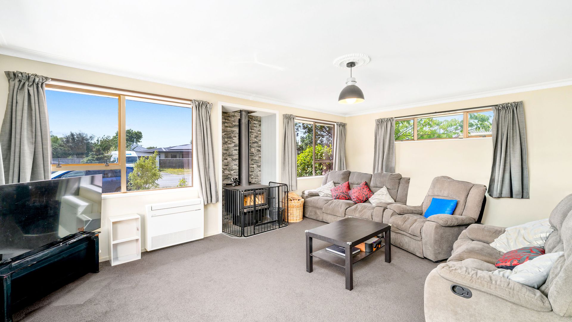 From the living area, sliding doors open to a covered veranda, creating a sheltered space for outdoor dining or relaxed evenings, while the street-facing windows are tinted to provide additional privacy. Heating is a real strength here, with a recently installed large freestanding log burner, a heat pump, and a heat transfer system that keeps all three double bedrooms warm through the cooler months.