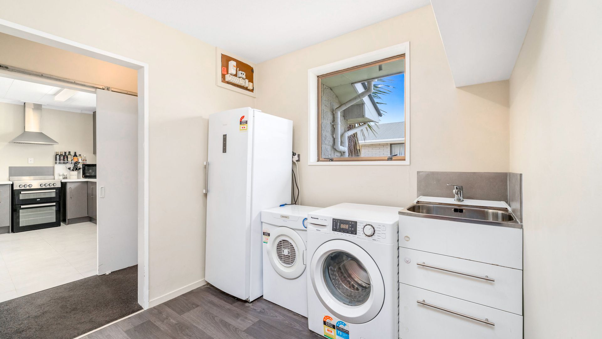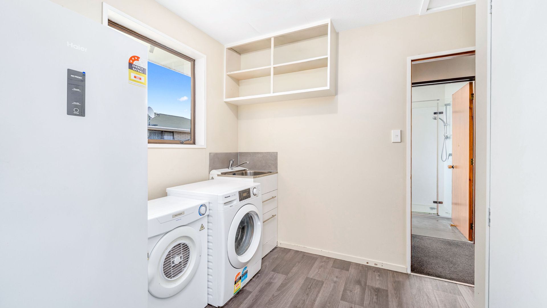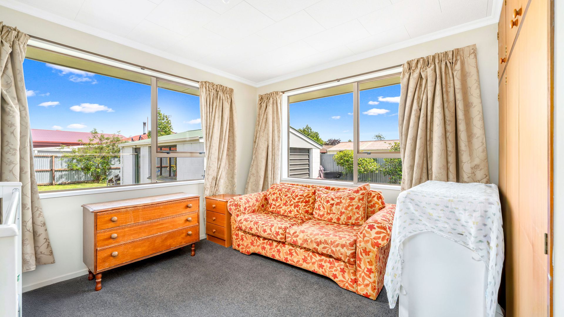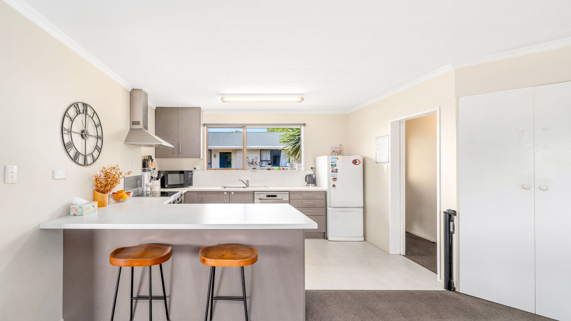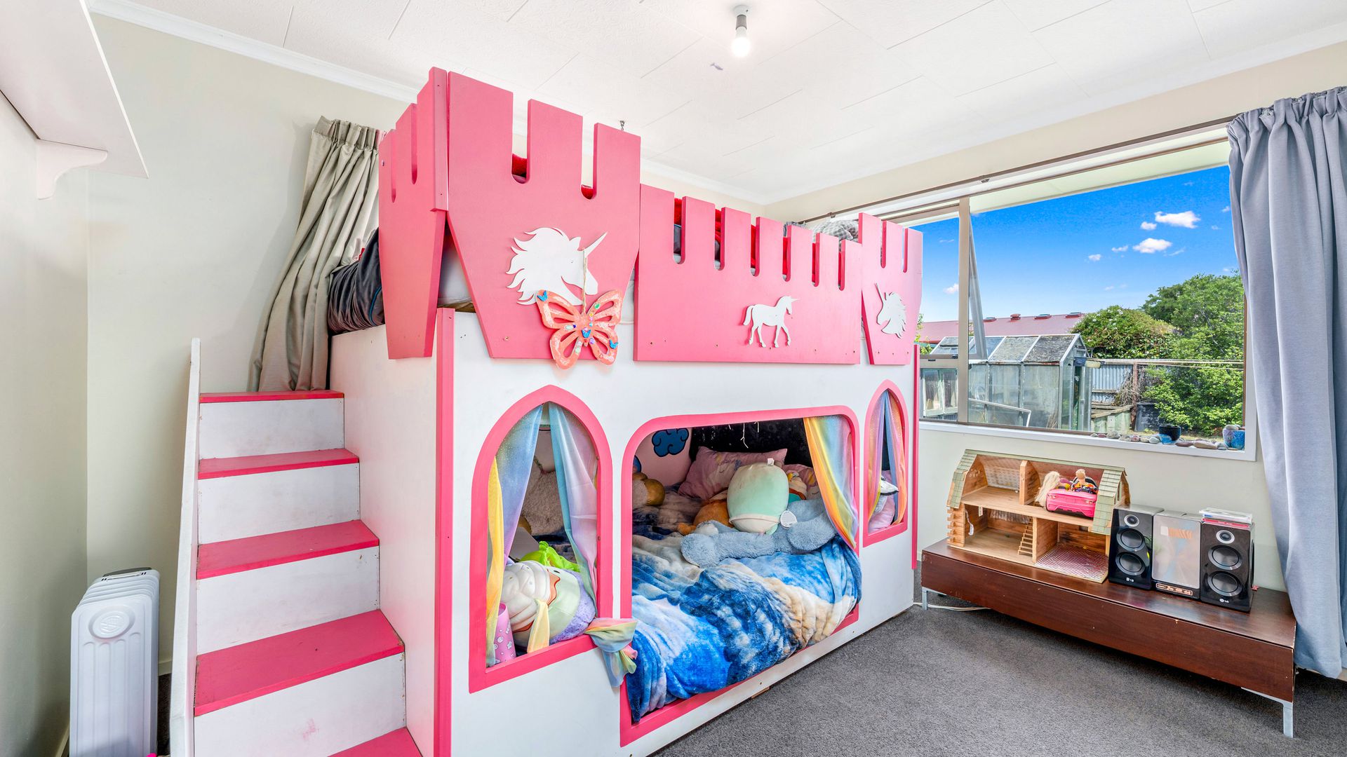 From the living area, sliding doors open to a covered veranda, creating a sheltered space for outdoor dining or relaxed evenings, while the street-facing windows are tinted to provide additional privacy. Heating is a real strength here, with a recently installed large freestanding log burner, a heat pump, and a heat transfer system that keeps all three double bedrooms warm through the cooler months.