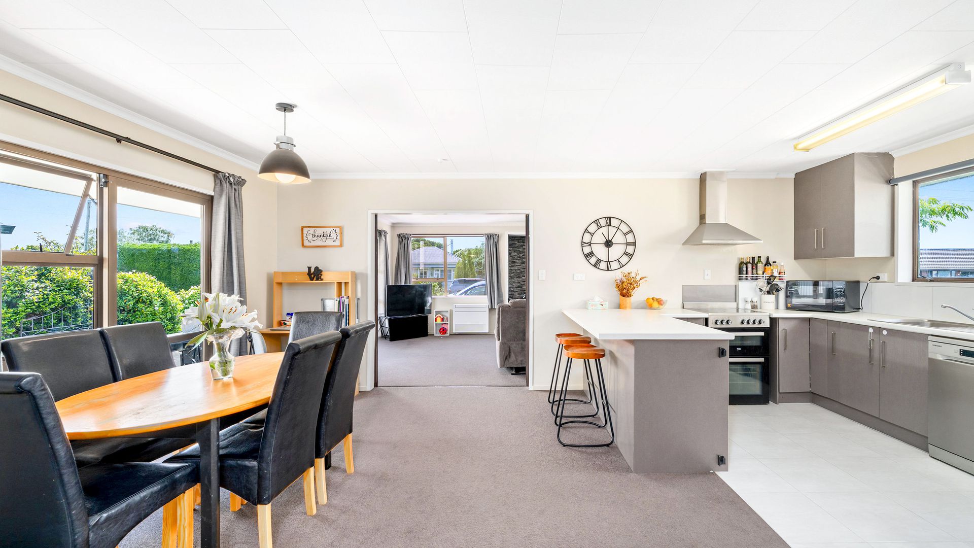 The kitchen, dining, and living areas are well laid out for everyday family life. The generous kitchen features updated appliances: a dishwasher, a stove with an electric cooktop and dual ovens, a water purifier system, and gas hot water. The living room can be closed off from the kitchen and dining area with sliding doors, providing flexibility for busy households or quiet evenings.