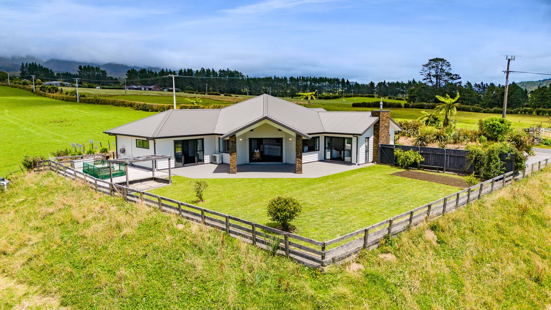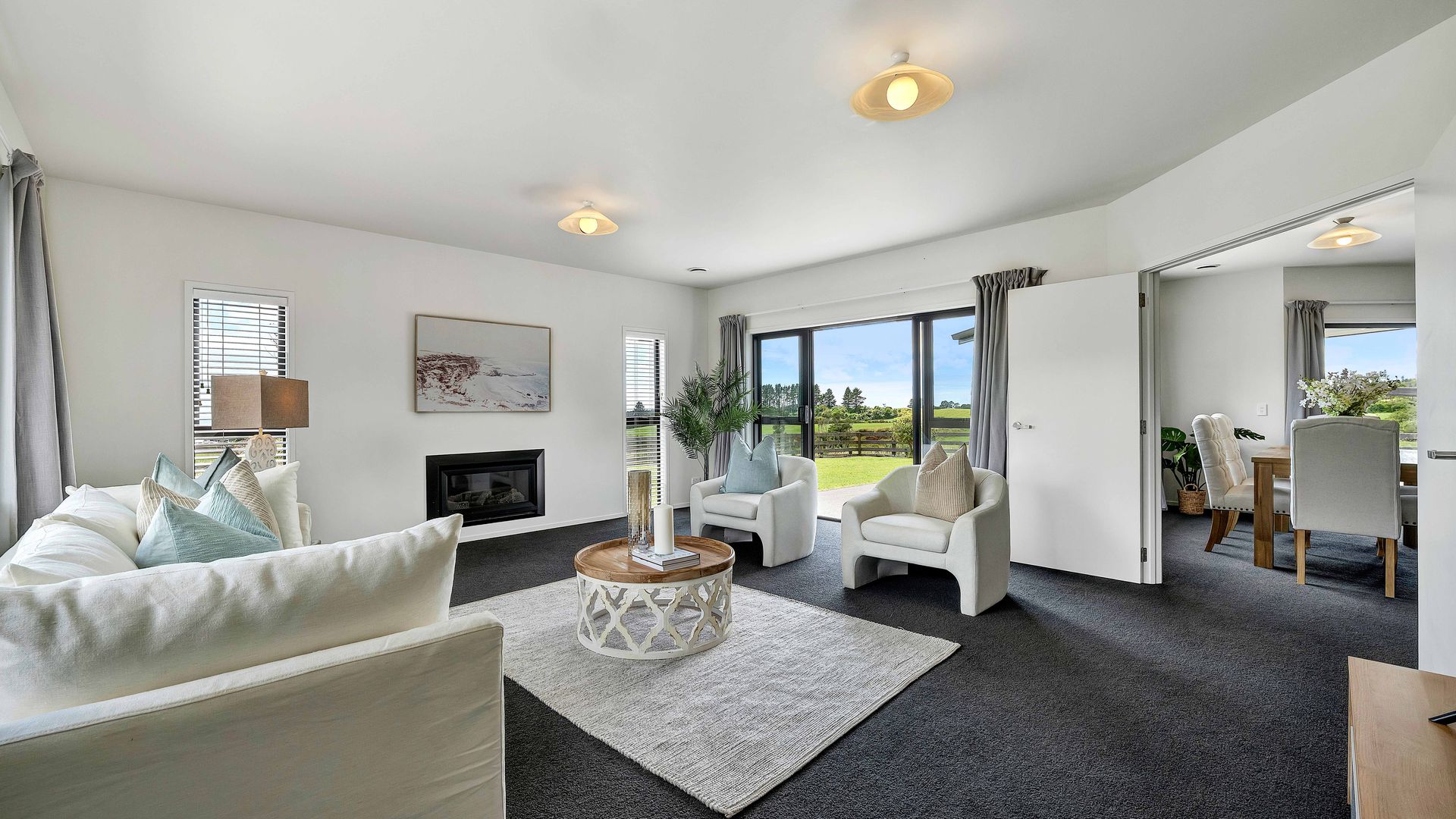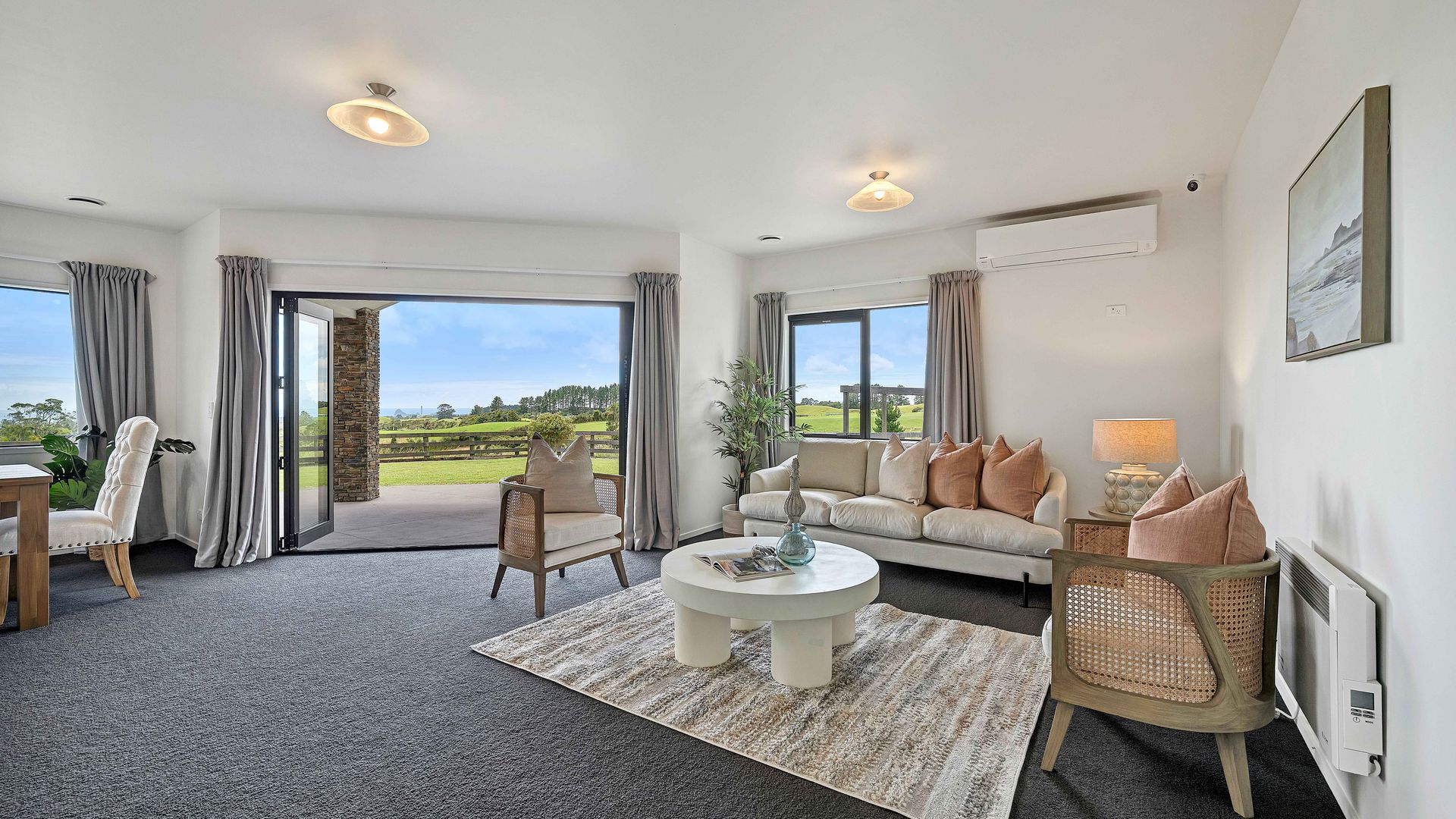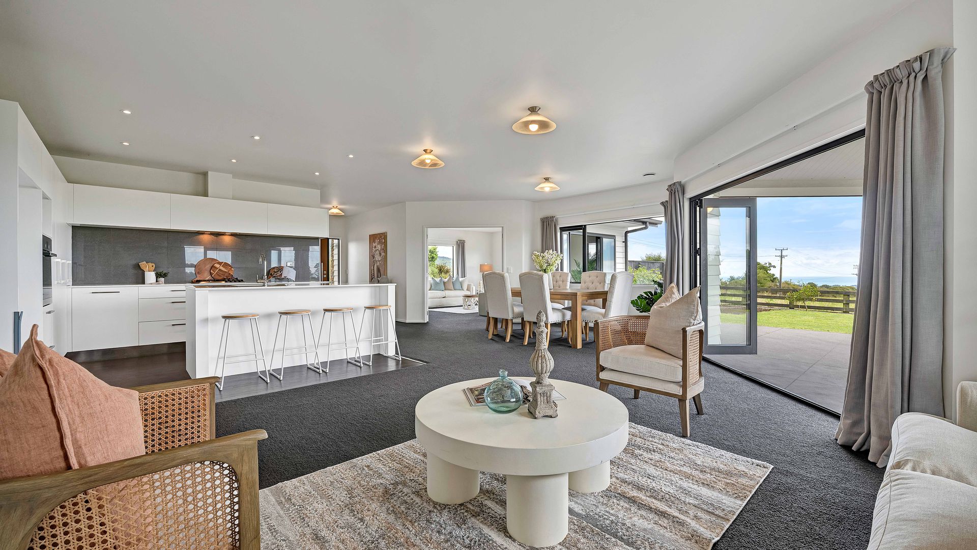 Breathe a little deeper at 713 Plymouth Road, Koru, where the day begins with sweeping rural outlooks that roll all the way to the sea, and finishes with the mountain sitting quietly on the horizon. This is the kind of place that slows the pace in the best way, with space to spread out and views that keep pulling your eyes outdoors. Inside, the home presents beautifully with clean white walls, grey carpet, and dark timber-look flooring. The open-plan kitchen, dining, and living zone is light-filled and generous, anchored by a modern kitchen with crisp white cabinetry, loads of storage, and a central island with breakfast bar seating and a sleek splashback. A second living area offers options for family life, open for easy flow or closed off when you want privacy. Double doors invite you out to the covered concrete patio, made for long summer lunches and easy evening meals.