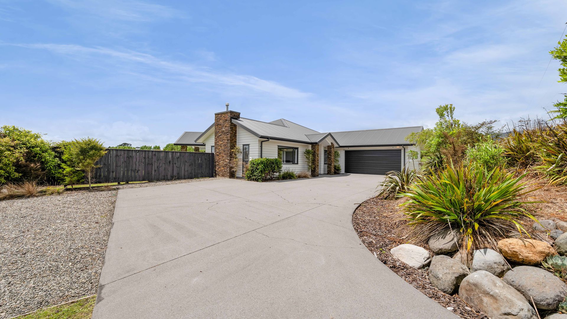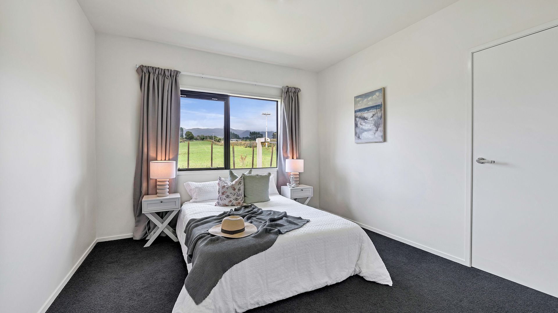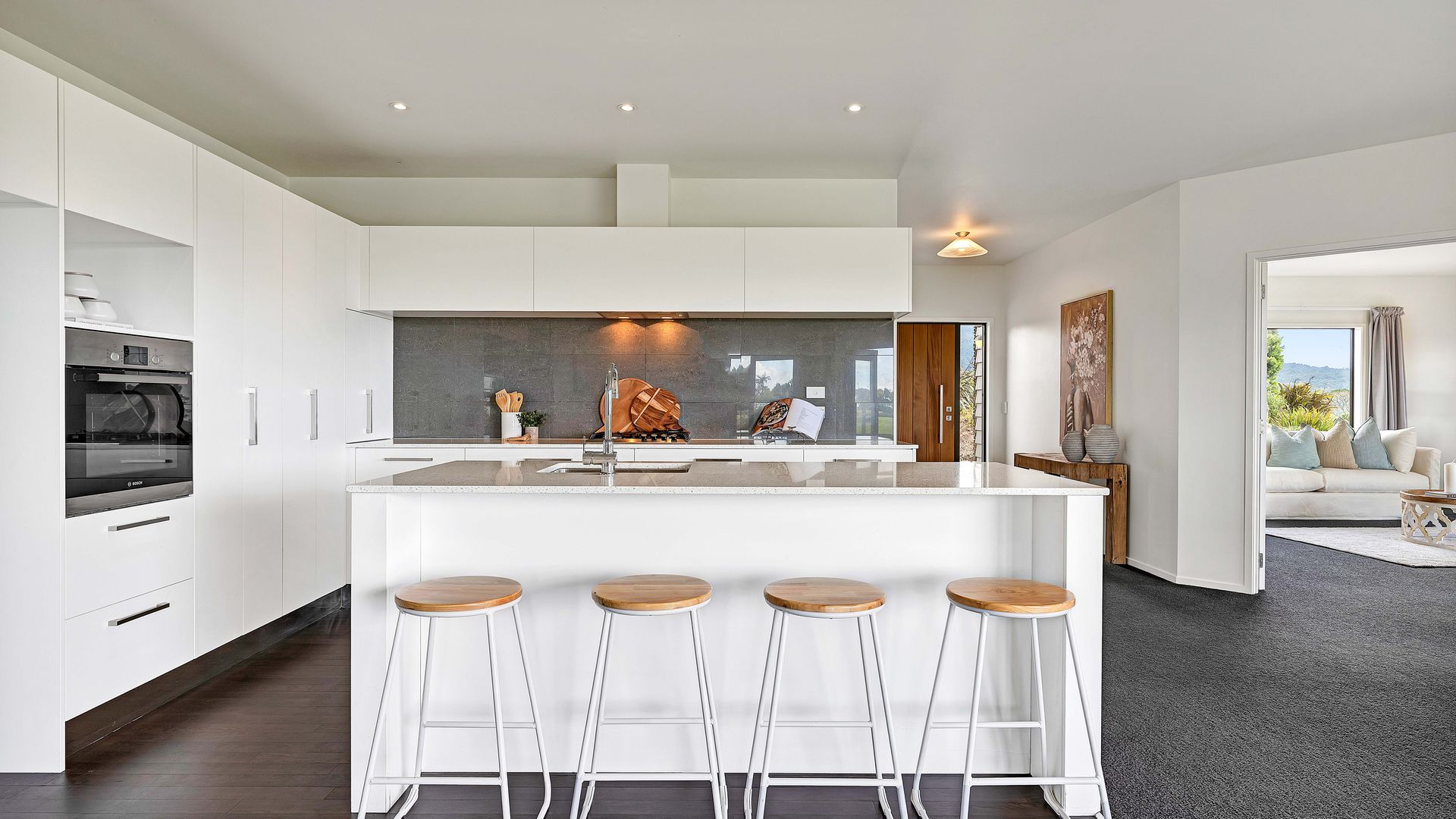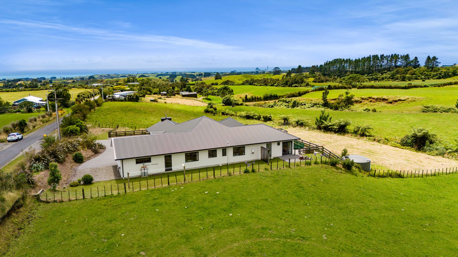 Breathe a little deeper at 713 Plymouth Road, Koru, where the day begins with sweeping rural outlooks that roll all the way to the sea, and finishes with the mountain sitting quietly on the horizon. This is the kind of place that slows the pace in the best way, with space to spread out and views that keep pulling your eyes outdoors. Inside, the home presents beautifully with clean white walls, grey carpet, and dark timber-look flooring. The open-plan kitchen, dining, and living zone is light-filled and generous, anchored by a modern kitchen with crisp white cabinetry, loads of storage, and a central island with breakfast bar seating and a sleek splashback. A second living area offers options for family life, open for easy flow or closed off when you want privacy. Double doors invite you out to the covered concrete patio, made for long summer lunches and easy evening meals.