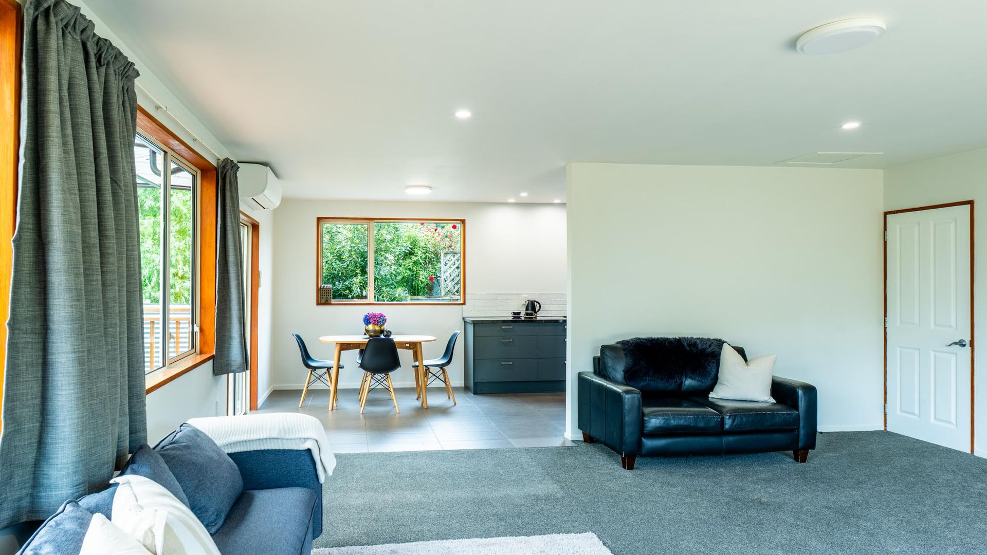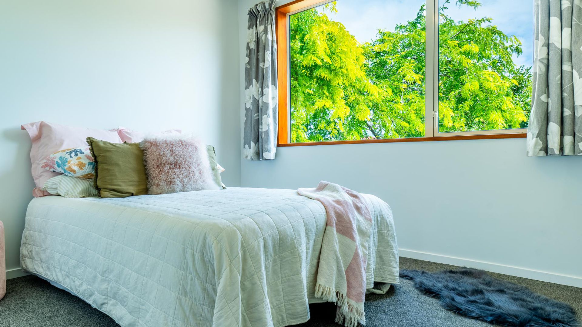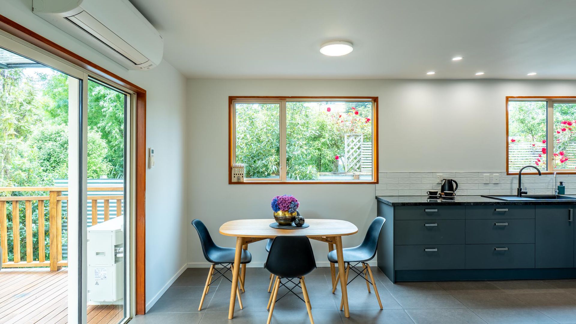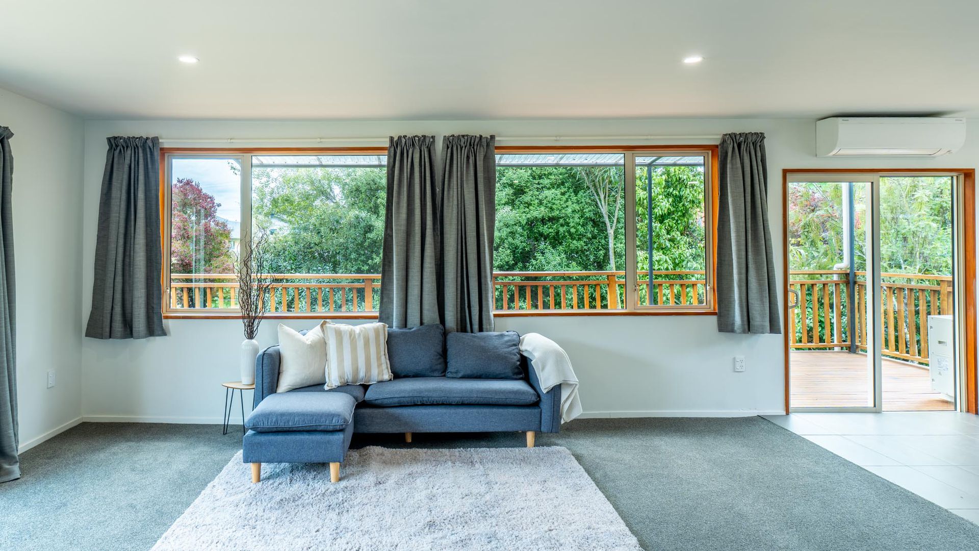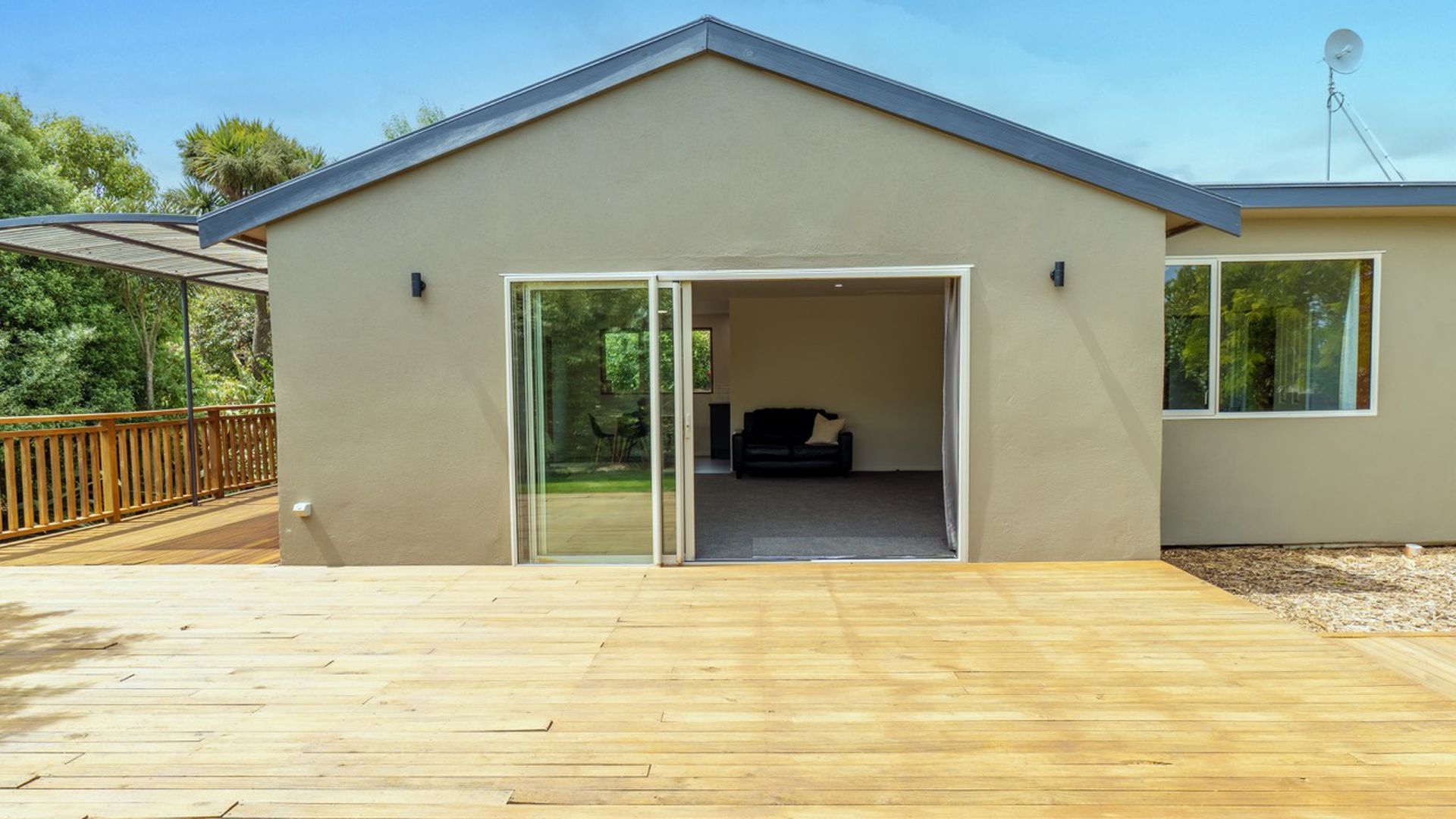 Surrounded by established trees, the home feels like a sanctuary. A wraparound deck with pergola creates the perfect space to relax or entertain, while seamless indoor–outdoor flow is achieved through two sets of sliding doors—one from the kitchen and one from the lounge.
