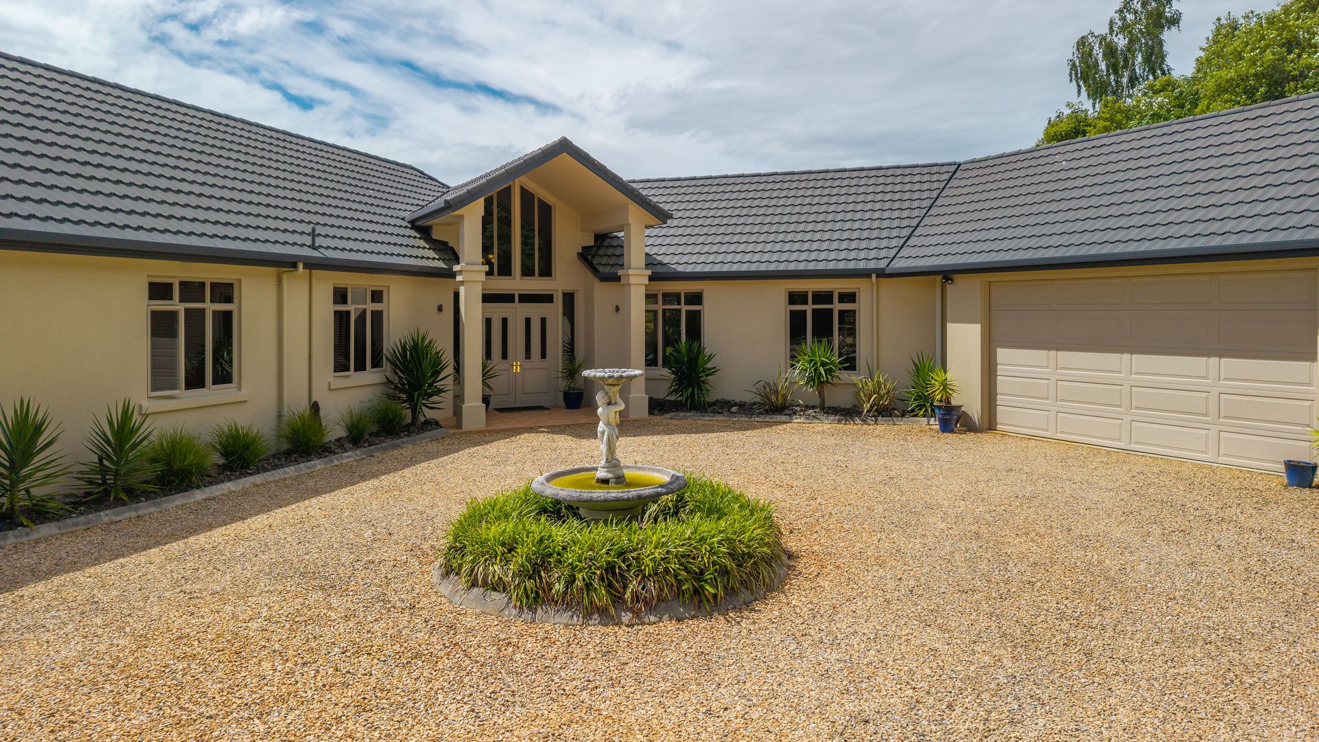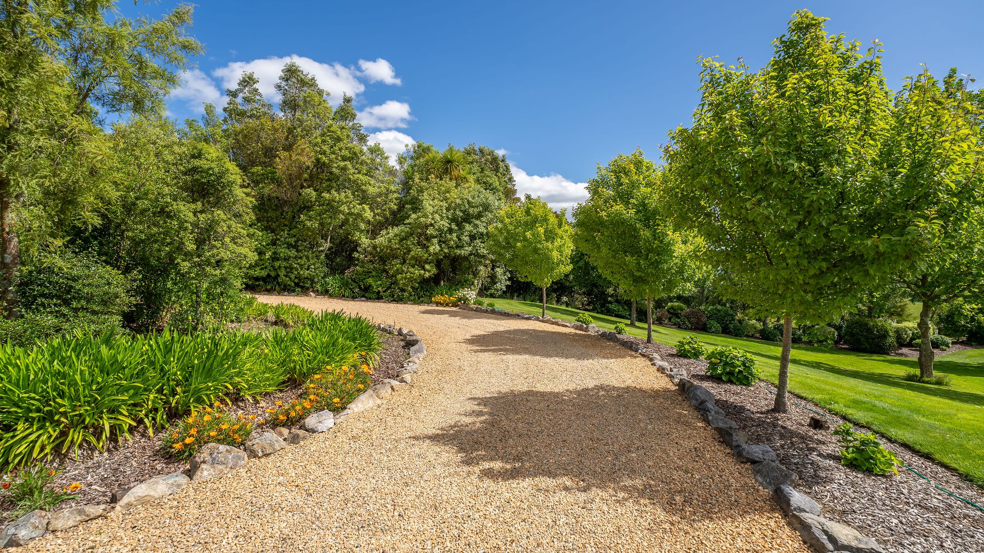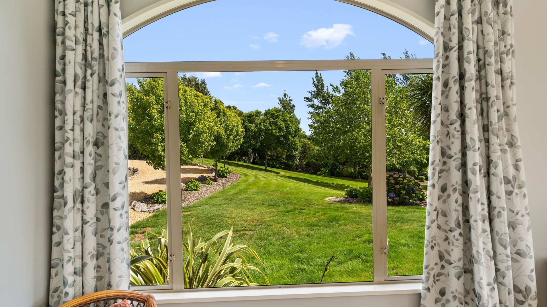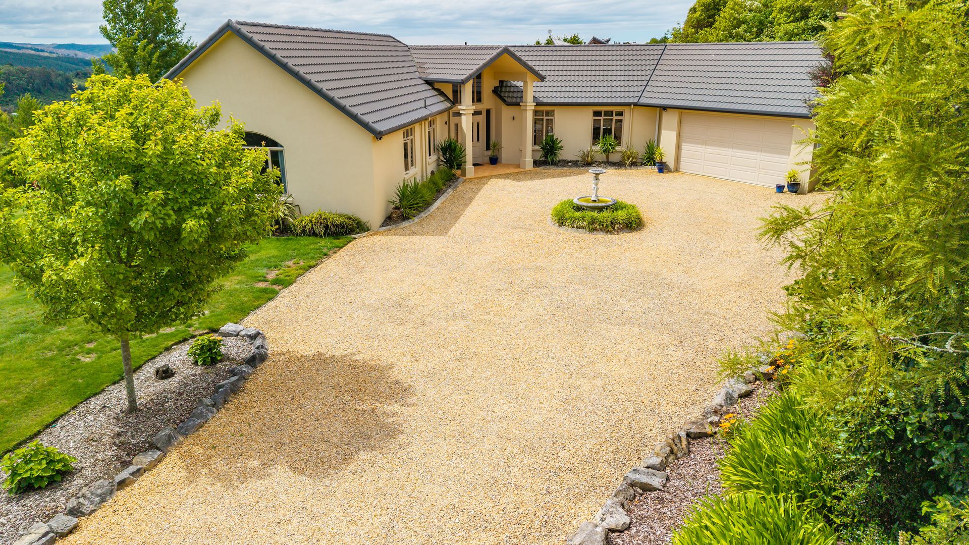 Come through the gates and be prepared to go Wow! You first notice the neat, golden driveway winding through a sublime setting of beautiful mature trees and sweeping lawns that draw your eyes across the long valley views. Then you cant help but notice the grand home set on the edge of the circular drive, totally sheltered from the road by established gardens. Built to impressive but gracious proportions, you are welcomed at the entrance by the double height atrium, with light flowing from generous glazing everywhere you look in this stunning home. From there, you have the option of moving into the kitchen and living area, or through into a separate formal lounge, with the high stud throughout adding to the feeling of spaciousness and light. The kitchen is a delight – with broad granite bench tops punctuated with the warmth of rimu; a 900mm gas hob and split electric oven, a handy twin sink, dishwasher, rangehood and good sized fridge freezer. Past the kitchen are the utility areas of the home – a separate laundry and a carpeted, internal access garage. The main bedroom suite is one of the most beautiful I have seen in a while, with picturebook windows framing your own personal park. The 2 other bedrooms are both well sized, with built in wardrobes and a lovely outlook of their own. A walk in airing and storage cupboard is such a bonus, and the home is heated by a heatpump and gas fire.